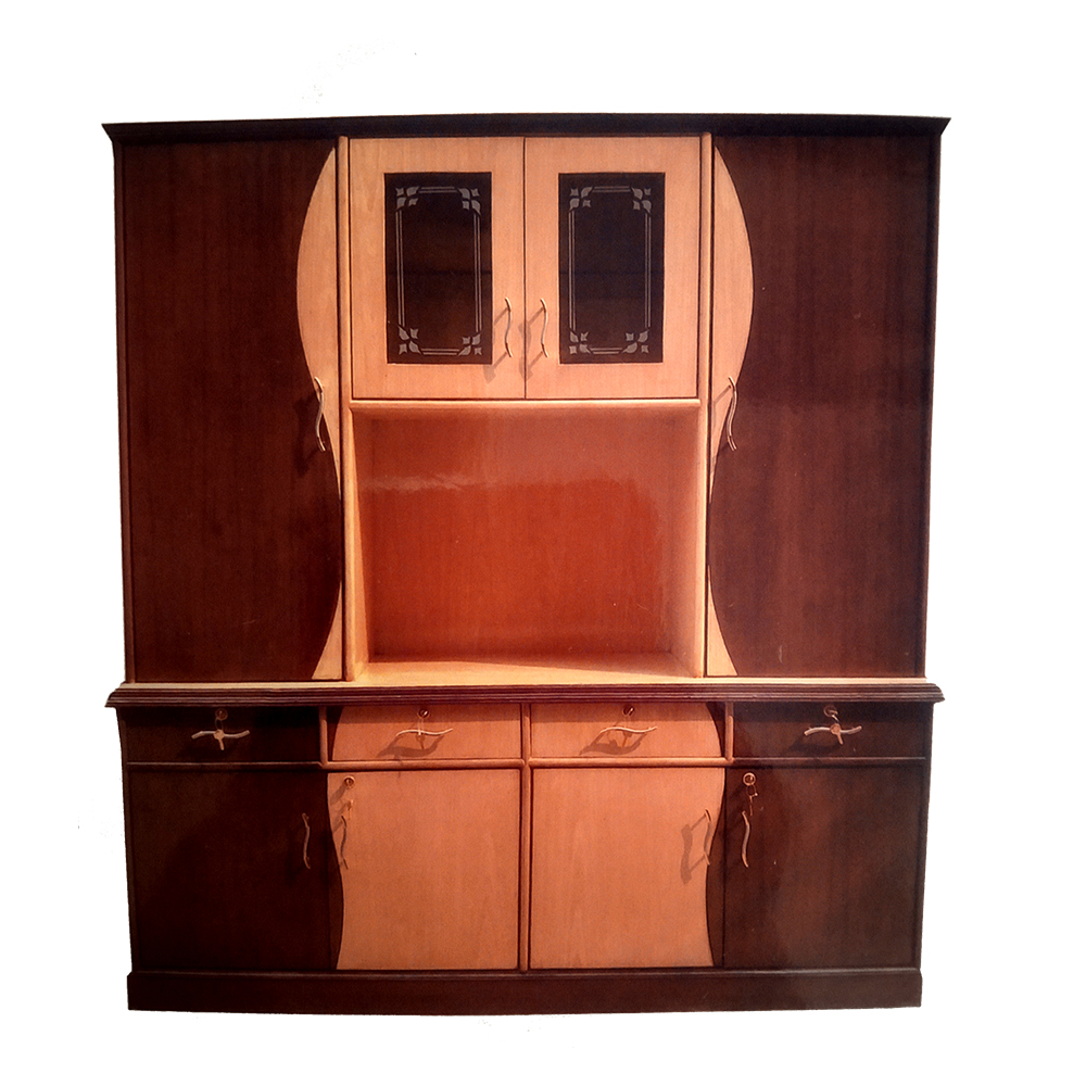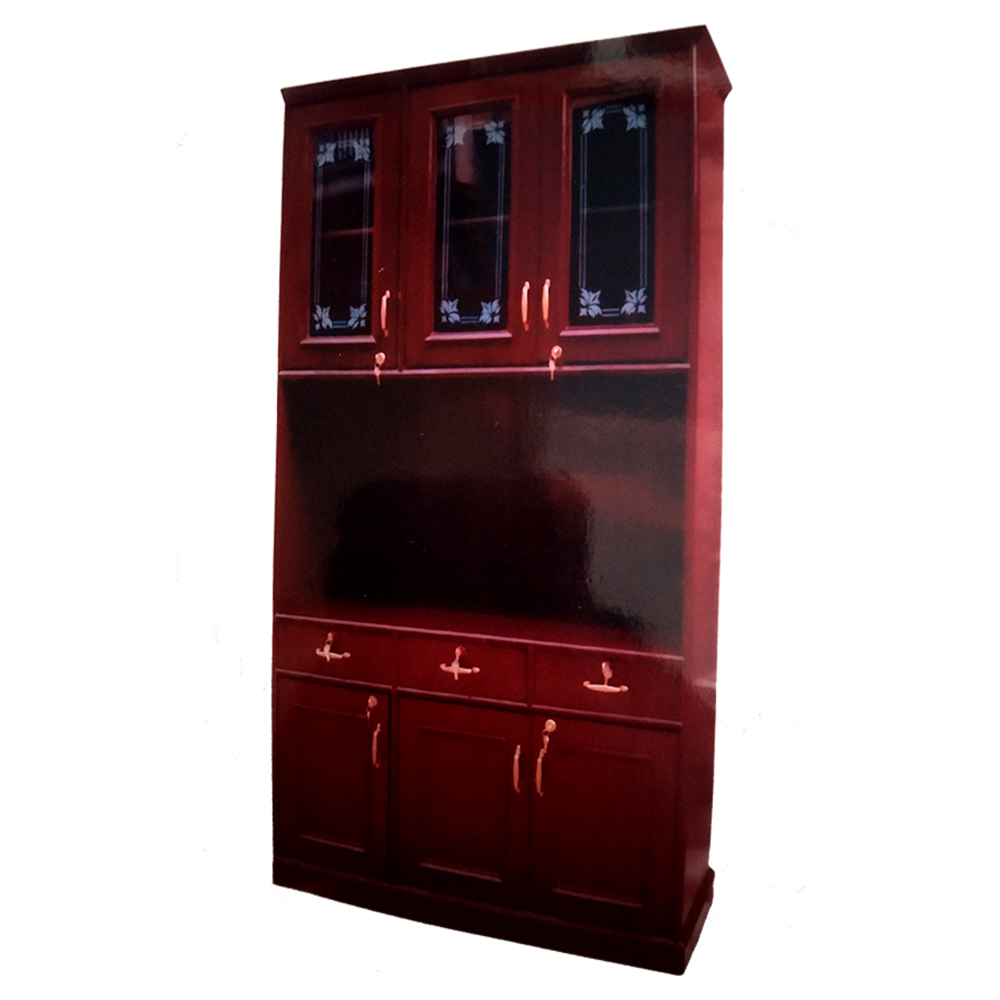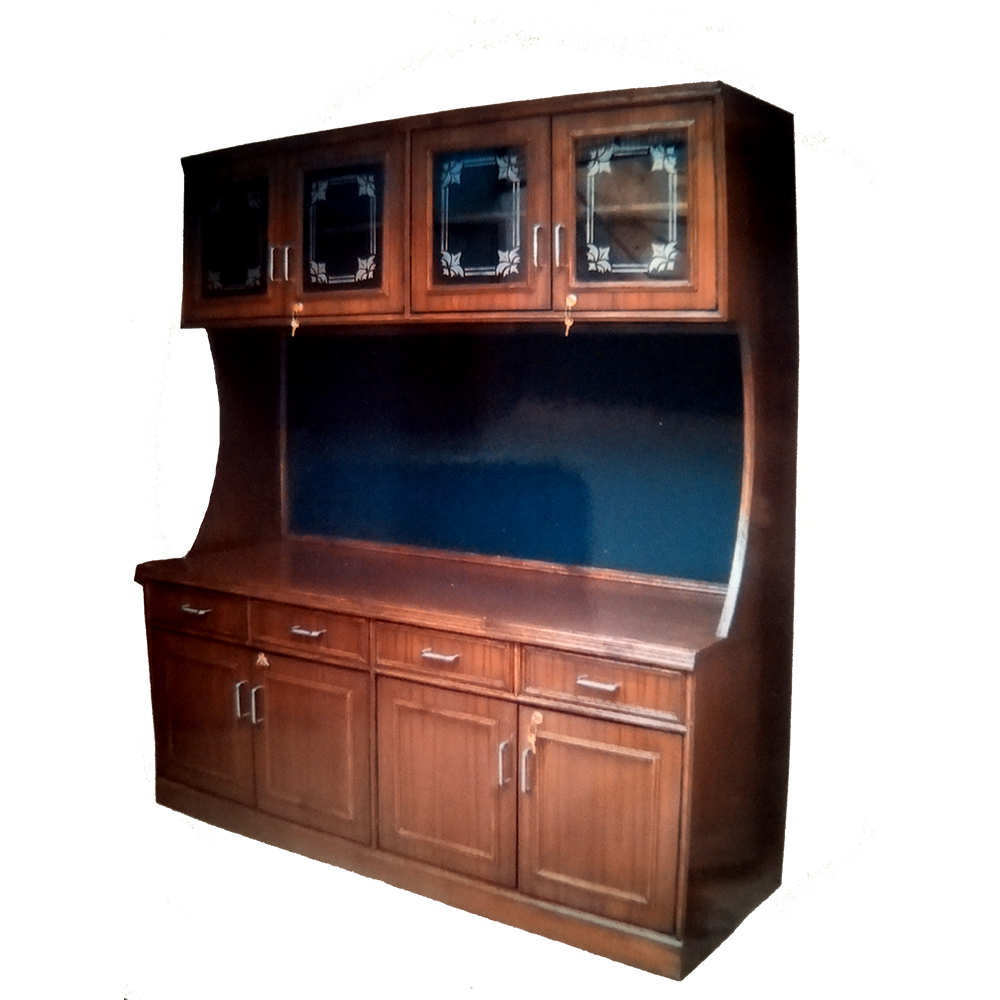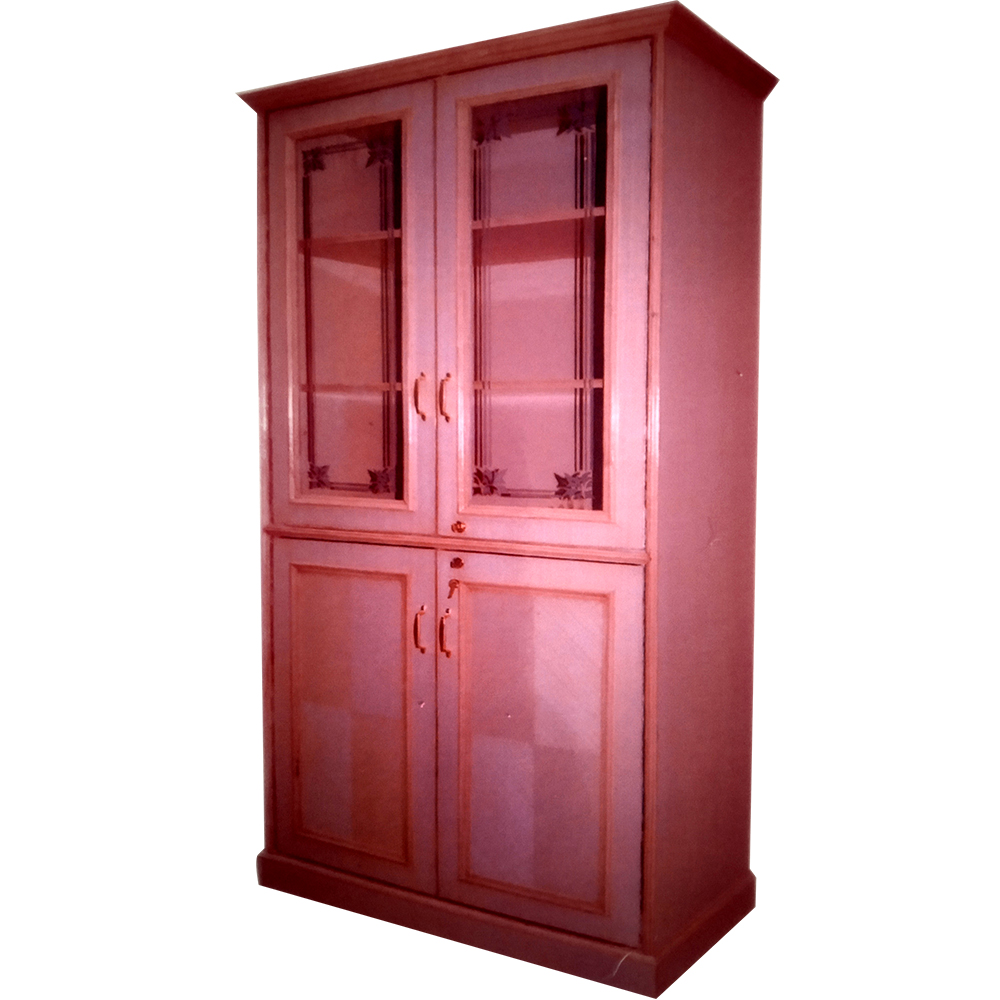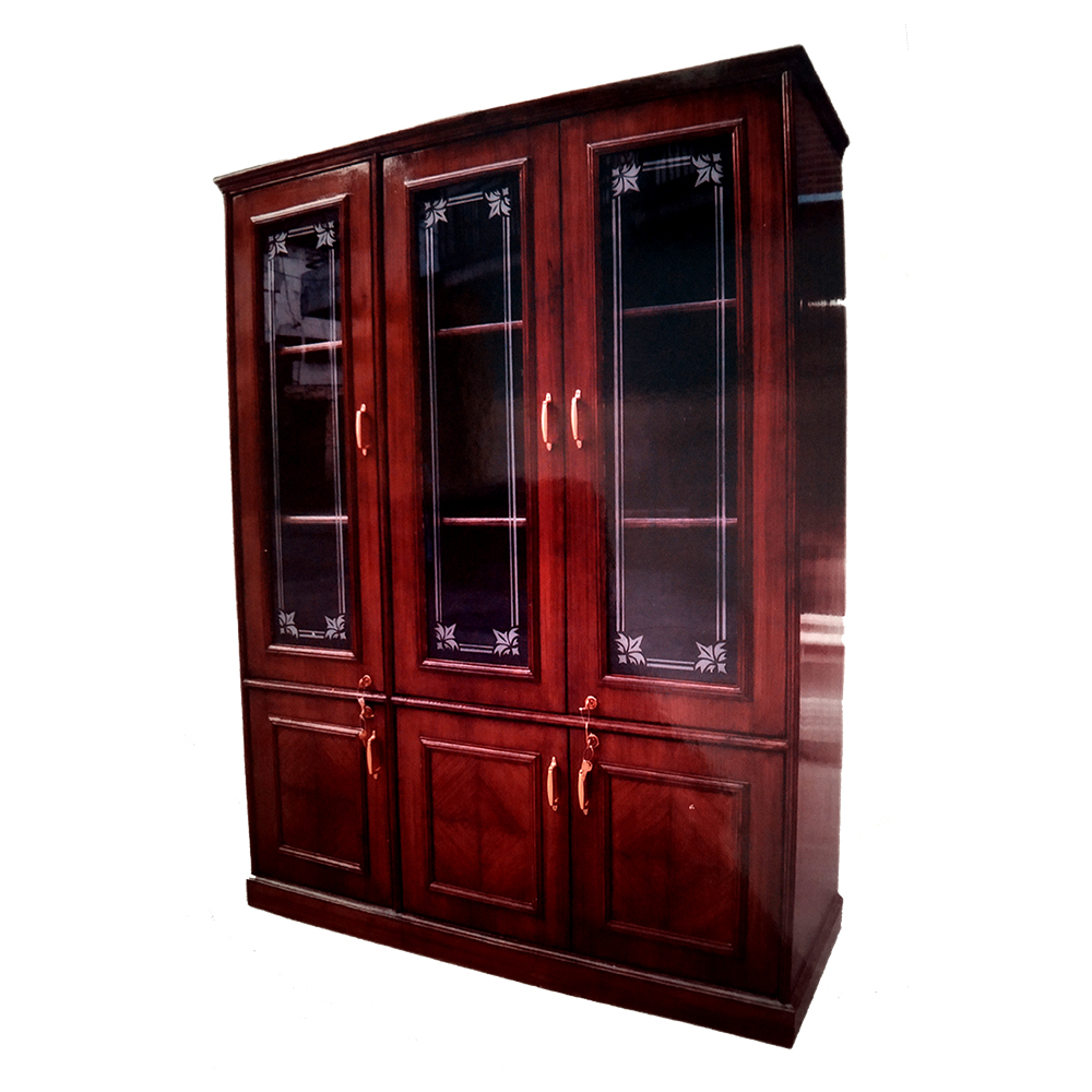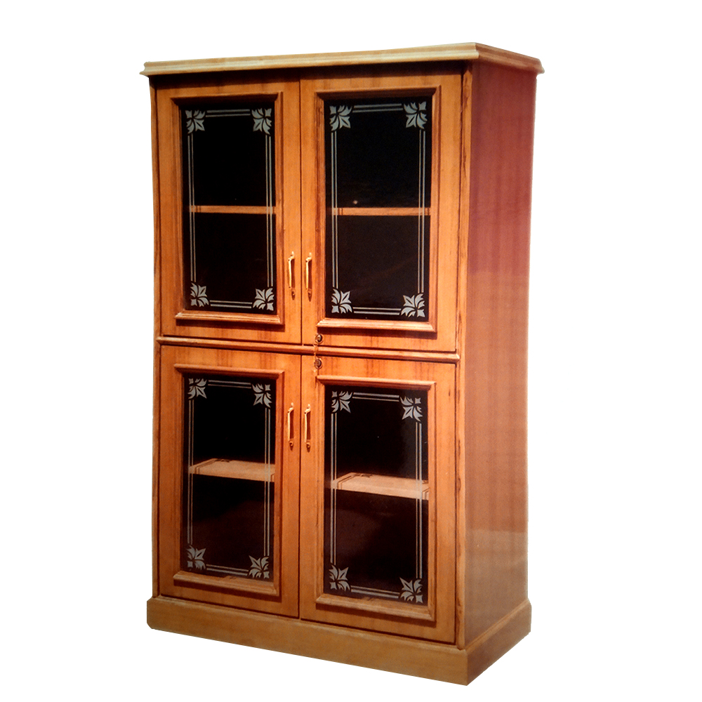 Wooden Book Shelf with glass panelled door, brass handle, lock & key, teak venees design and wooden panelled door on bottom of bookshelf.